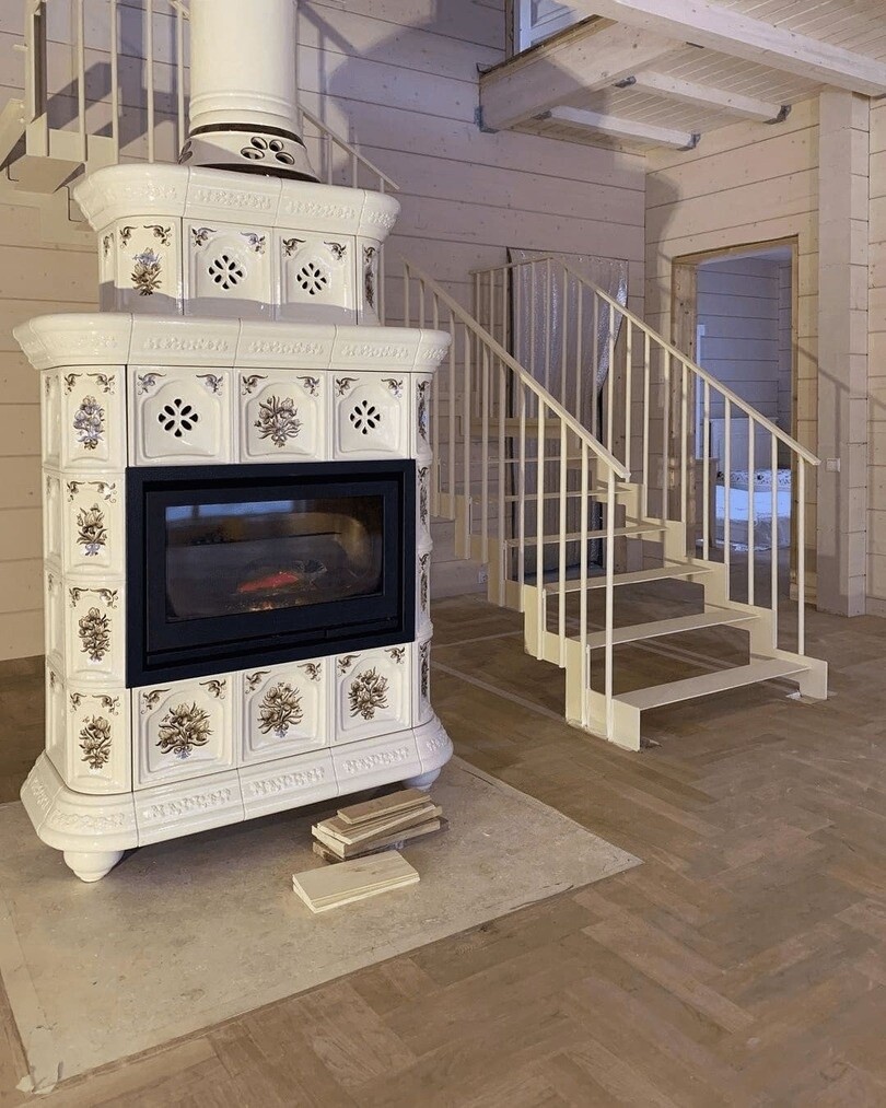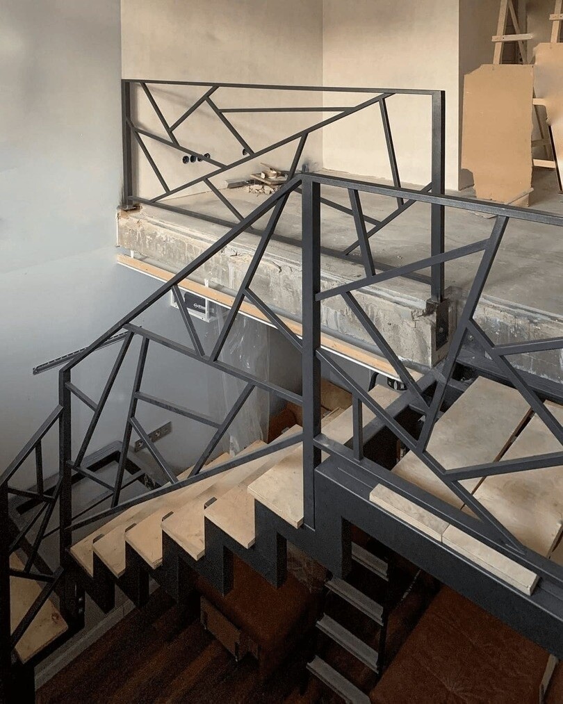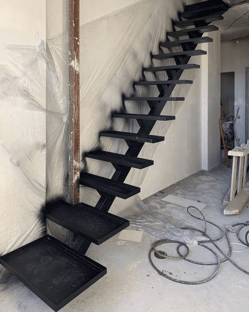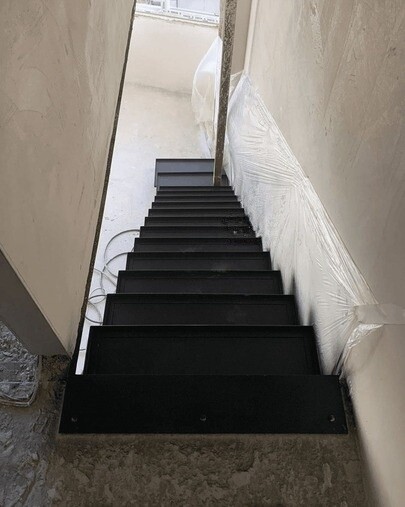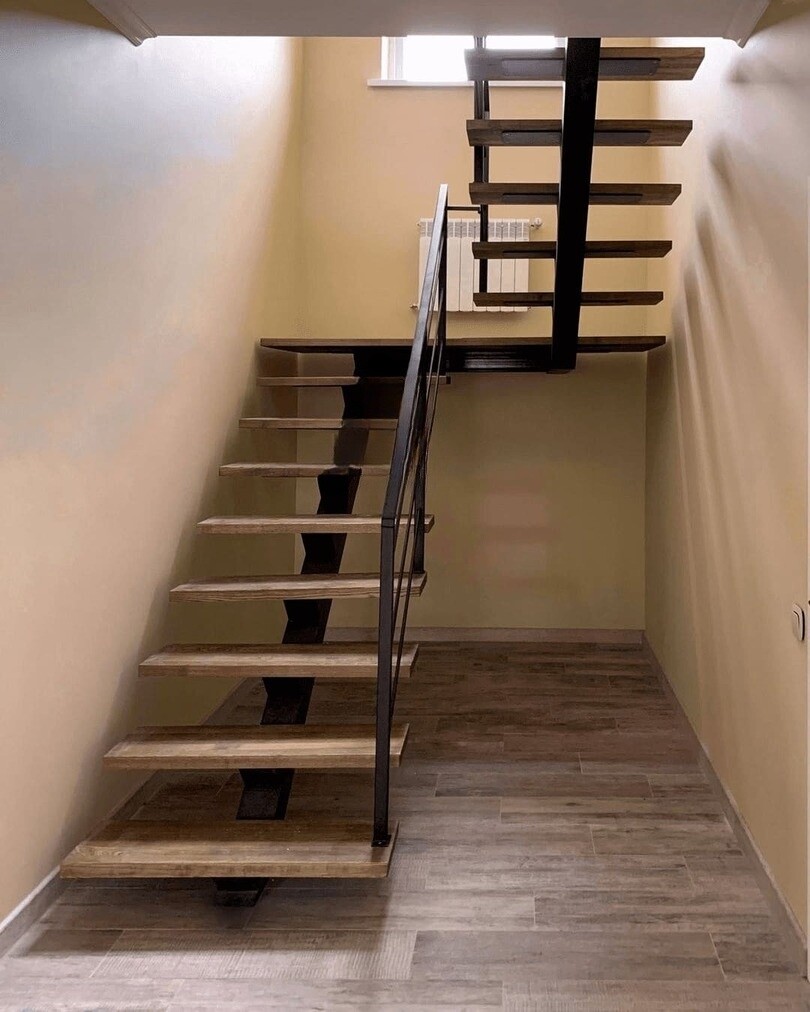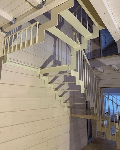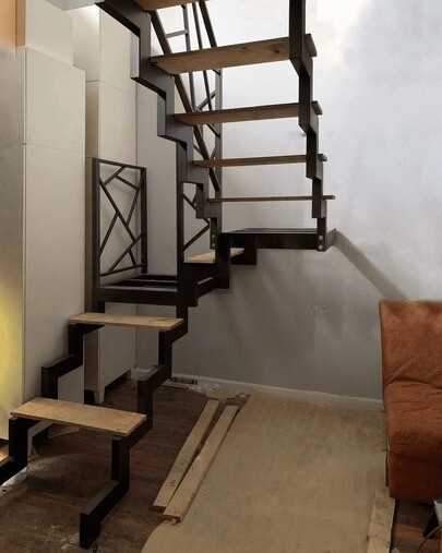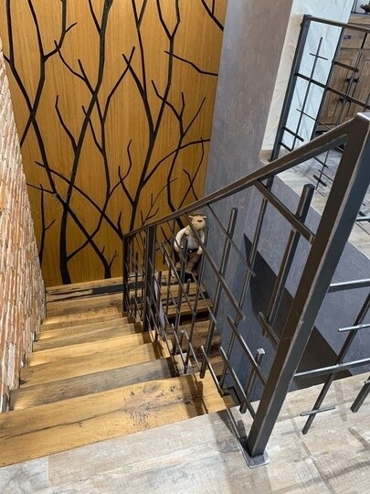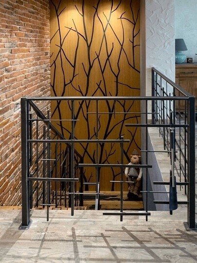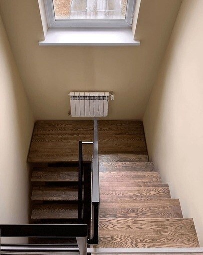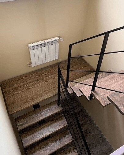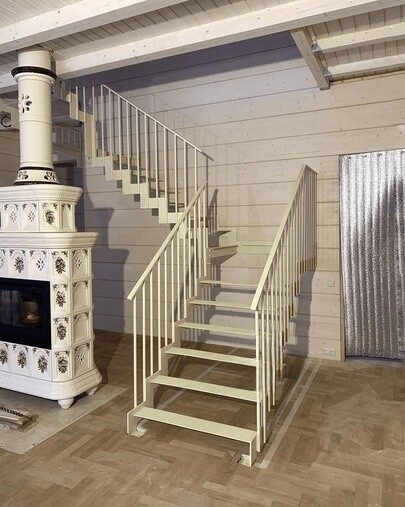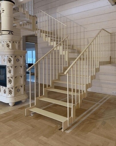 Металлический каркас собирался в частном доме, чтобы лестница органично смотрелась в интерьере, мы покрасили в бежевый цвет.
